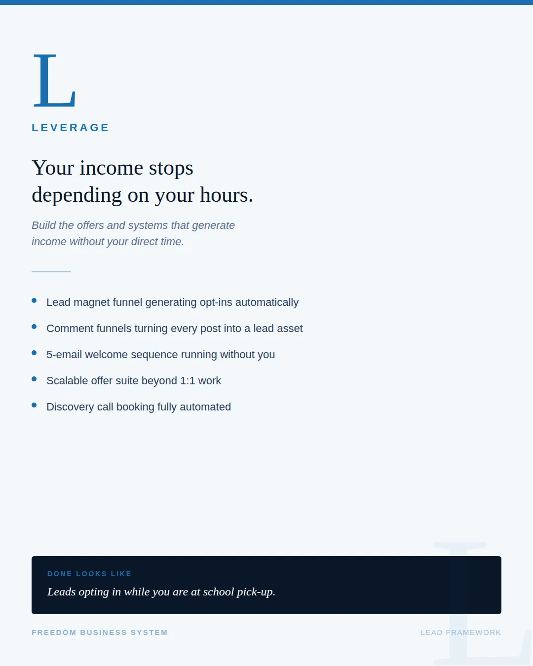 The Leverage layer is where you design your offer suite and lead generation system so that income is no longer directly tied to your time.