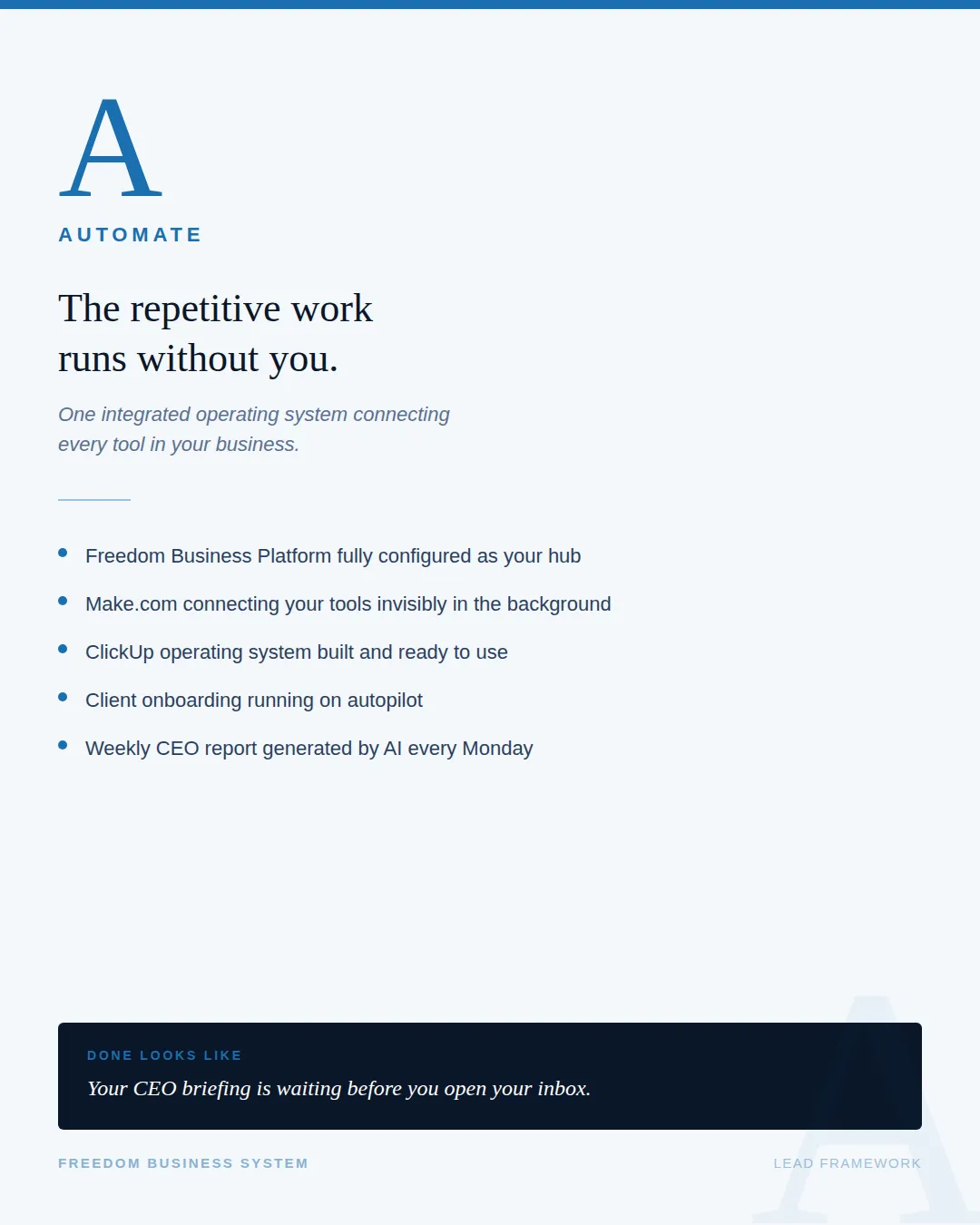 Automate is the technical infrastructure layer. This is where your Freedom Business Platform, Make.com, ClickUp, and your social scheduling tools connect into one integrated operating system. Every repetitive task - lead nurture, client onboarding, content scheduling, weekly reporting - runs without you touching it.