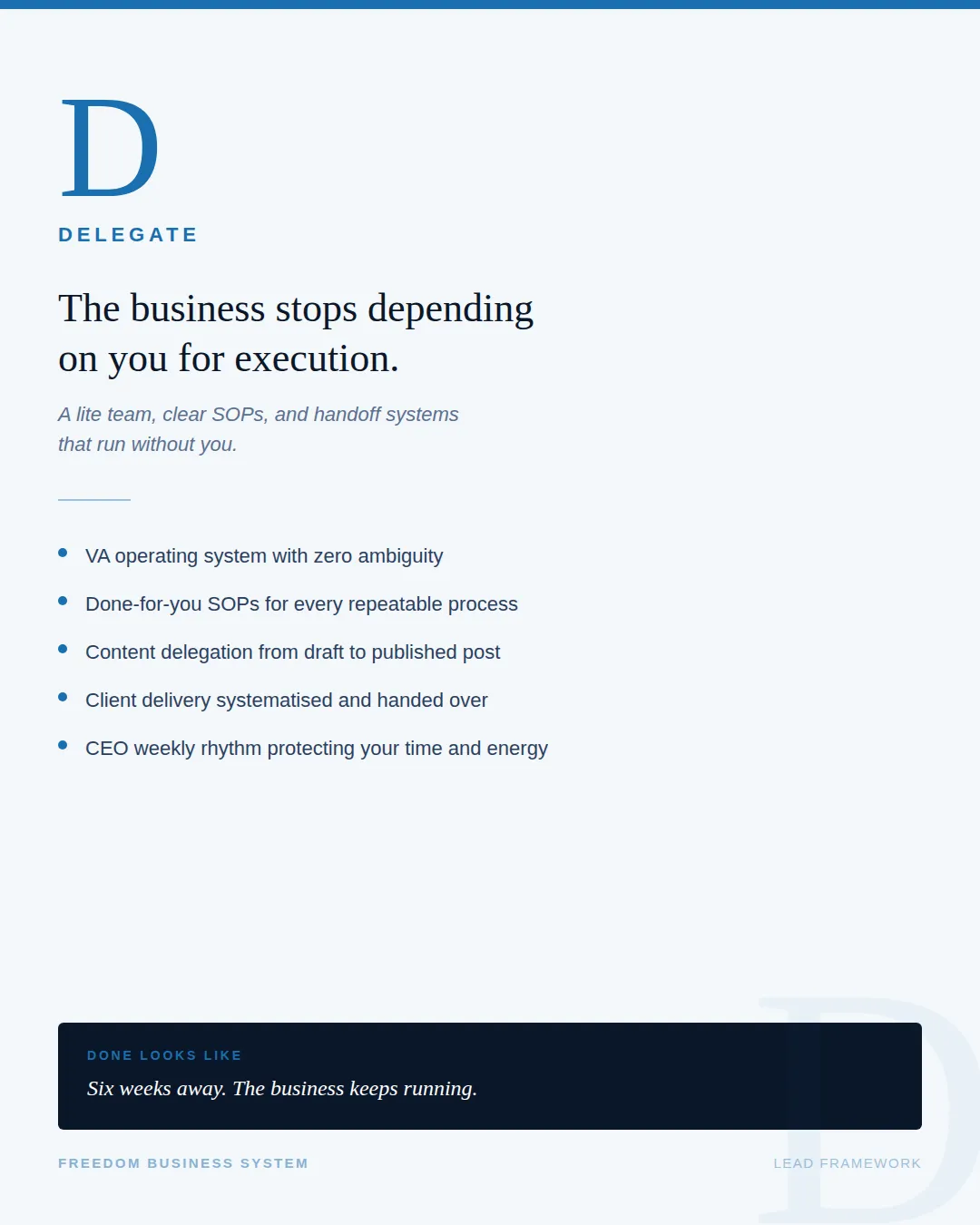 Delegate is the final layer - the people, processes, and handoff systems that mean you are no longer the person doing everything. This is not about building a large team. It is about building a lite team: two or three part-time, task-based people guided by the systems and SOPs you have already built.