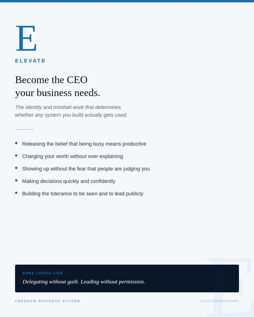 Elevate is the identity and mindset work. Not affirmations - operational identity. The shift in how you think about your role, your time, your value, and your authority. This is the work that determines whether any system you build actually gets used.